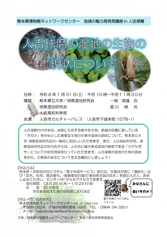 【1月31日(土)開催予定】地域の魅力再発見講座in人吉球磨「人吉球磨の湿地の生物の現状について」